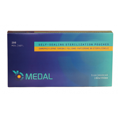 Samoprzylepne torebki foliowo - papierowe wykonane zostały z papieru medycznego o gramaturze 60g/m2 (Papier medyczny zgodny z normą EN PN 868-3 z wysoką wytrzymałością mechaniczną zarówno na sucho jak i na mokro) i wielowarstwowej folii PET/CPP (przezierny laminat foliowy PET/CPP wielowarstwowy - 6 warstw + warstwa kleju, który umożliwia łatwą indentyfikację zawartości pakietu, kolor: niebieski, grubość: 52 µm). Torebki stosowane są do sterylizacji narzędzi medycznych parą wodną (STEAM). Szeroka gama rozmiarów zapenia możliwość wyboru produktu do konkretnych wymagań i przeznaczenia, a samoprzylepna taśma klejąca ułatwia szybkie przygotowanie pakietu. Taśma samoprzylepna umożliwia przygotowanie pakietu bez konieczności użycia urządzeń zgrzewających.