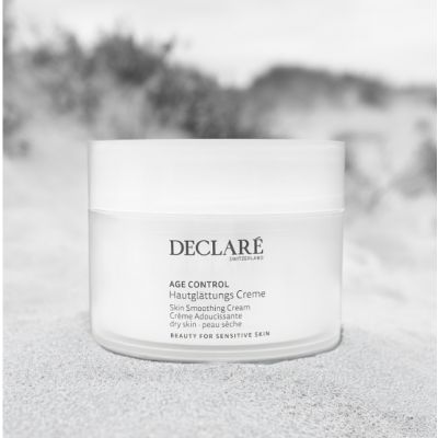 Krem Declaré Age Control Skin Smoothing Cream zawierający bogate składniki (42% zawartość lipidów z NMF, colagen, witaminę E i sorbitol) poprawia gładkość skóry, wzmacnia kontury twarzy i wspomaga elastyczność skóry. NMF ma działanie wygładzające i odbudowujące. Witamina E hamuje działanie wolnych rodników niszczących komórki. Dla skóry dojrzałej, do stosowania na twarz i szyję.