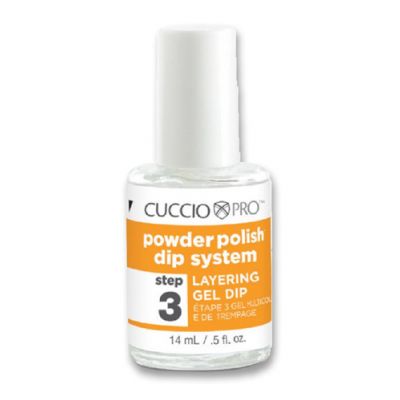 Żel międzywarstwowy Cuccio Powder Polish Dip Layering Gel Dip stosowany na warstwę pudru systemu Cuccio Powder Polish Dip System, w celu stworzenia maksymalnie trwałej stylizacji.