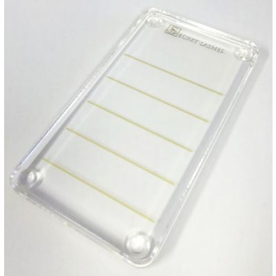 Podstawka do przyklejania pasków z rzęsami, która dzięki odpowiedniemu ciężarowi nie przesuwa się podczas zabiegu. Wykonana z plexi. Wymiary: 60x110x8 mm. 5 linii. Sygnowany logo Secret Lashes.