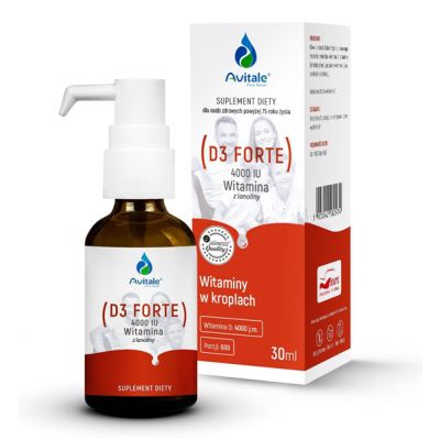 Avitale D3  Forte zawiera maksymalną dawkę witaminy D (aż 4000 IU w jednej kropli!) w postaci naturalnego cholekalcyferolu, pochodzącego z lanoliny. Witamina została rozpuszczona w oliwie z oliwek z pierwszego tłoczenia, dzięki czemu odznacza się wysoką przyswajalnością. Avitale Witamina D3 FORTE spełnia wymogi CLEAN LABEL – nie zawiera sztucznych i technologicznych dodatków, barwników oraz konserwantów.