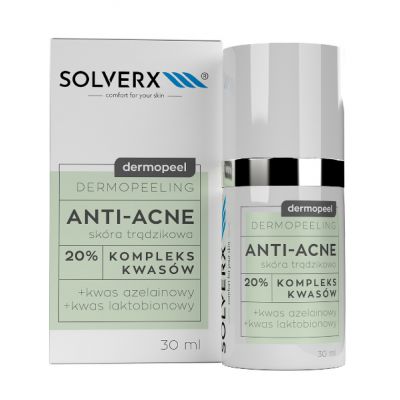 Dermopeeling kwasowy Solverx Dermopeel Dermopeeling Anti-Acne w formie żelowej przeznaczony do skóry trądzikowej (zarówno trądzik młodzieńczy, jak i różowaty). Skuteczność działania zapewnia 20% kompleks kwasów azelainowego z laktobionowym.