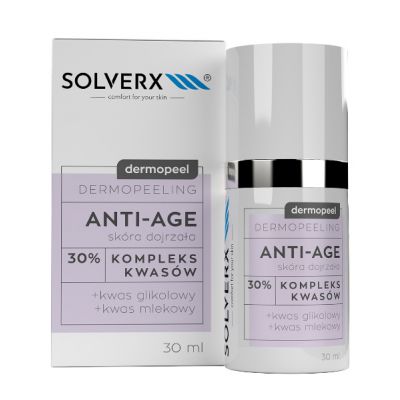 Dermopeeling kwasowy Solverx Dermopeel Dermopeeling Anti-Age w formie żelowej przeznaczony do skóry dojrzałej, wymagającej odmłodzenia. Skuteczność działania zapewnia 30% kompleks kwasów glikolowego z mlekowym.