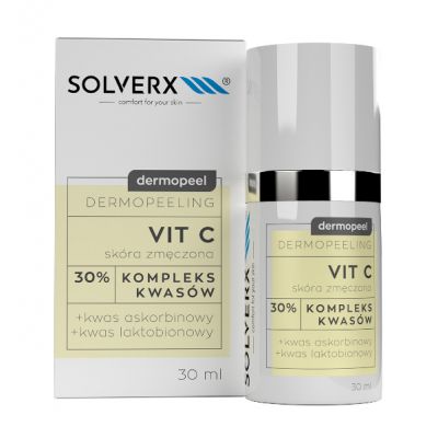 Dermopeeling kwasowy Solverx Dermopeel Dermopeeling Vit C przeznaczony do skóry matowej, szarej, z tendencją do rumienia, a także do tzw. "cery palacza". Skuteczność działania zapewnia 30% kombinacja witaminy C z kwasem laktobionowm.